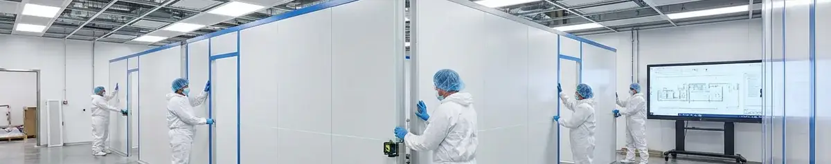 Panel cleanroom membentuk dinding, langit-langit, dan partisi ruangan. Panel ini terdiri dari dua lembaran baja berlapis (galvanis, powder coating, atau stainless steel) dengan inti insulasi PU, PIR, atau rockwool. Permukaan panel harus halus, non-porous, dan tahan terhadap bahan kimia pembersih yang digunakan dalam protokol sanitasi harian.
